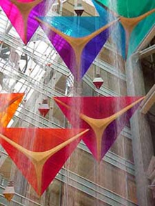 The Fountain Place drew considerable attention, and like a tsunami, projects began to crash in - the company's first international project and its first "choreographed" water and fire musical fountain in West Edmonton, Canada; the fountains gracing the Los Angeles Music Center; it's first "shooter" fountain using patented compressed-air technology for the Seto Ohashi Exhibition in Sakaide, Japan; and the restoration of the Prometheus Fountain at Rockefeller Plaza in New York City.